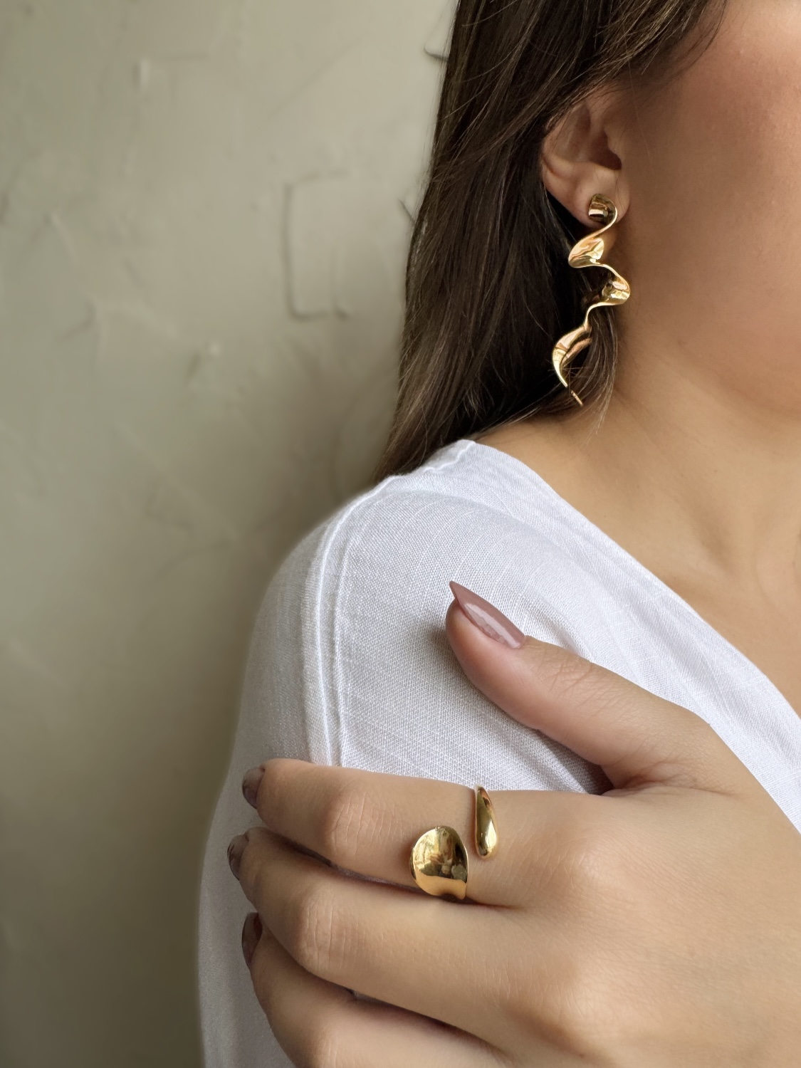 Anel regulável com formas arredondadas e assimétricas confeccionado em semijoia.
