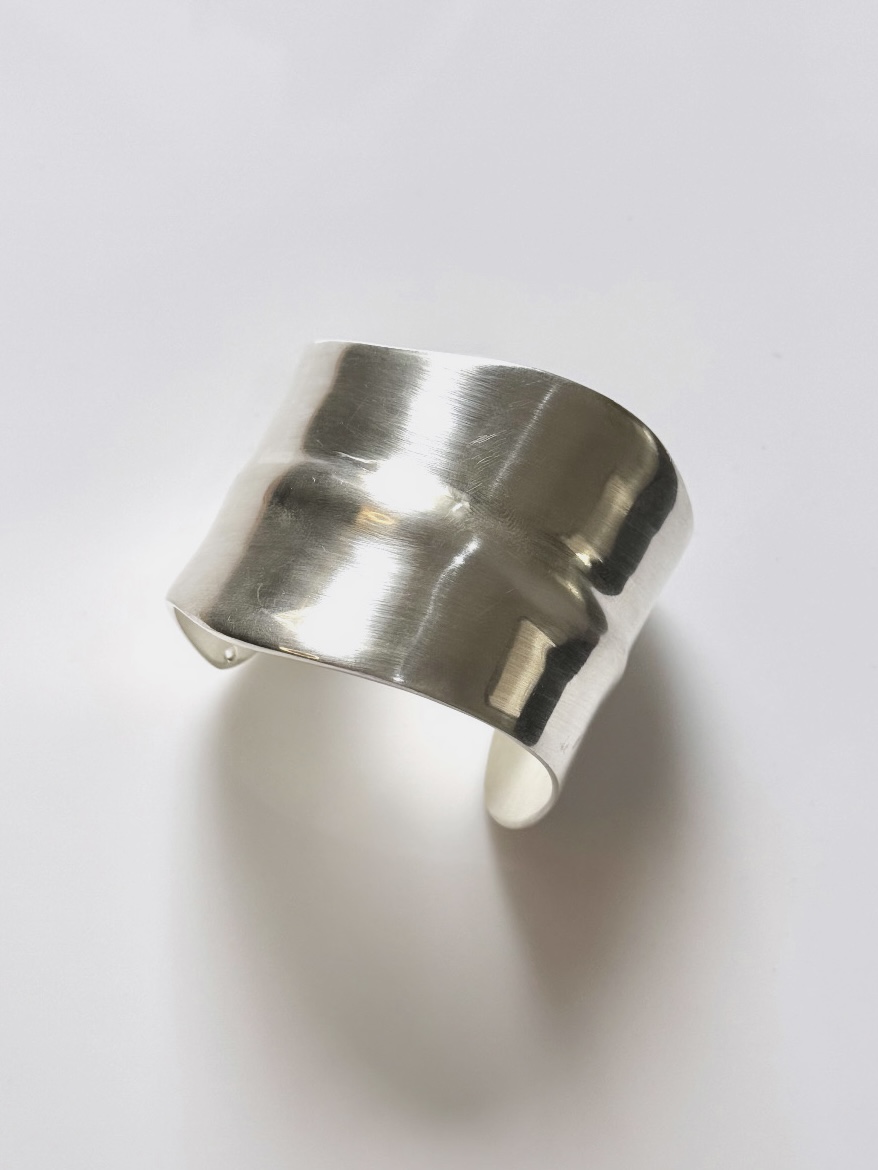 Bracelete rígido com leves ondulações confeccionado em bijuteria livre de níquel, com acabamento prateado fosco.