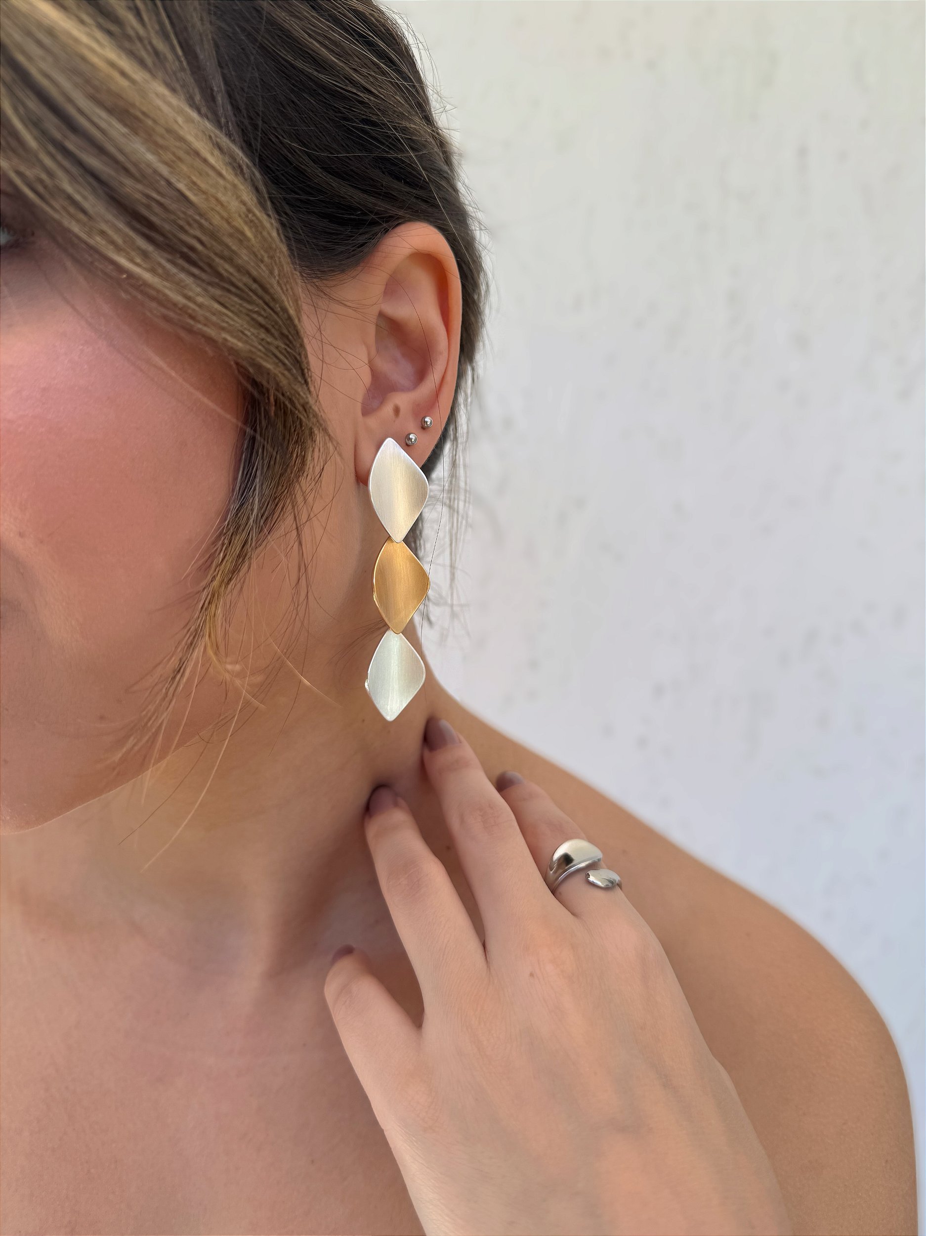 Brinco alongado em semijoia com design orgânico e mix de banhos prateado e dourado com acabamento polido fosco.