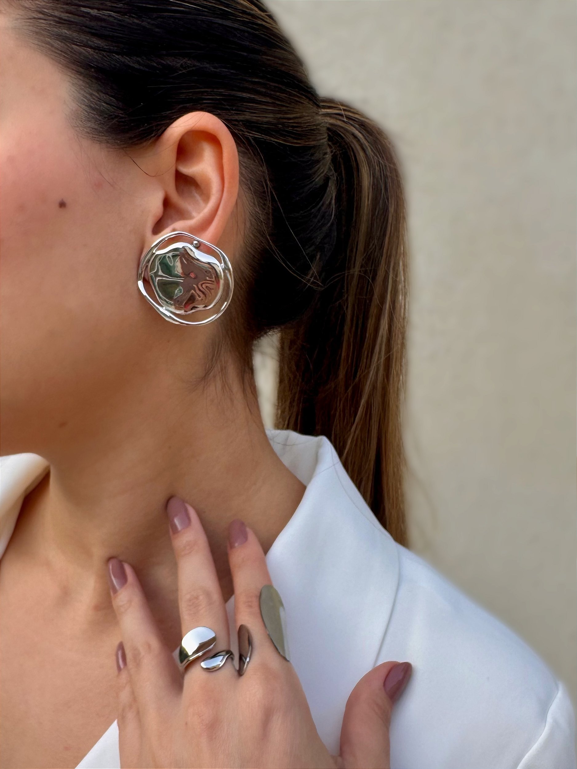O design assimétrico com efeito ondulado na superfície, que reflete os feixes de luz, garante originalidade e estilo único à essa peça, tornando-a protagonista em qualquer produção, seja para ocasiões especiais ou para elevar o visual no dia a dia. A variante em banho dourado transmite sofisticação e calor, ideal para compor looks clássicos e elegantes. Já a versão prateada traz modernidade e versatilidade, perfeito para produções urbanas e contemporâneas.