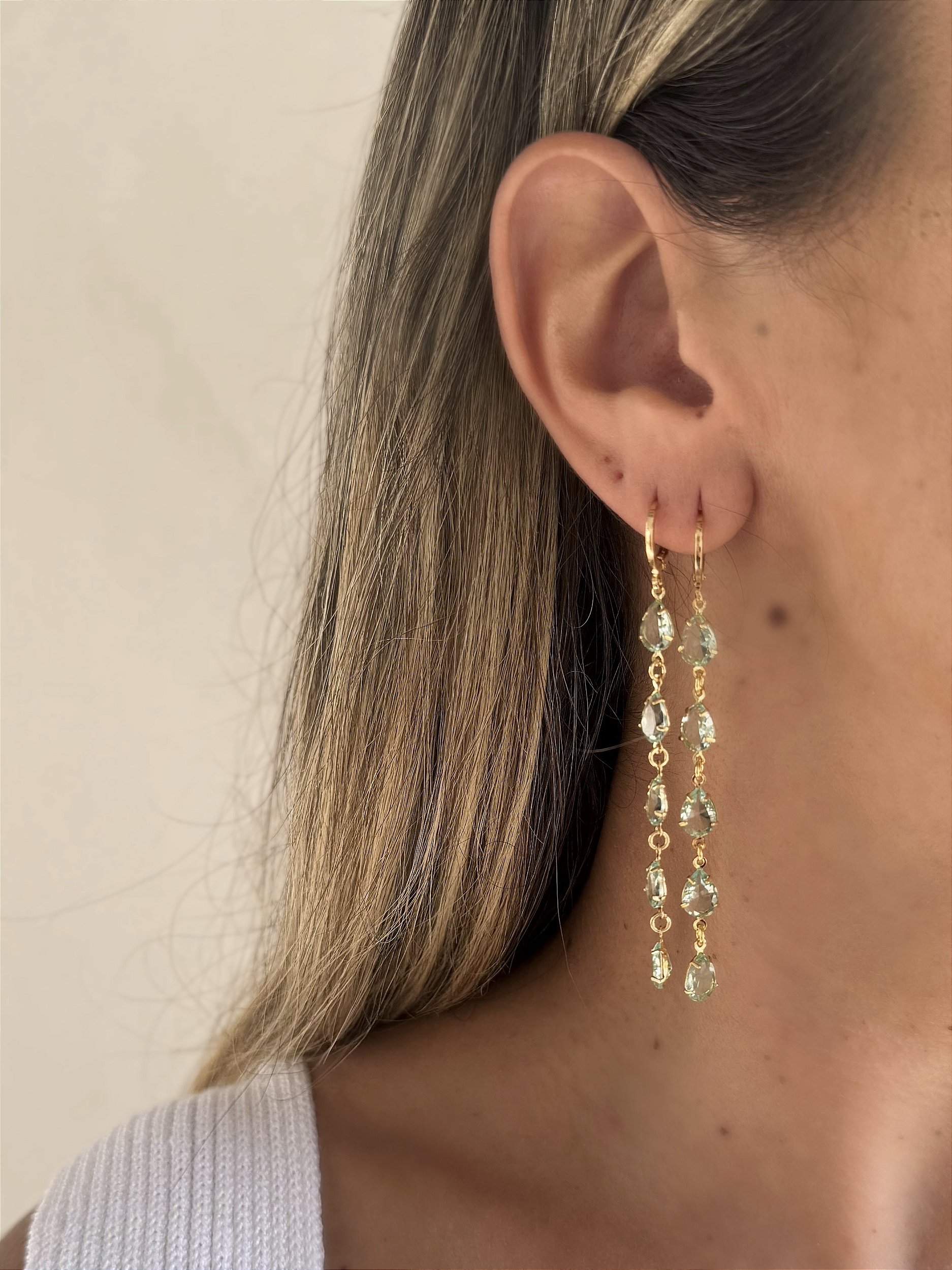 Elegante e delicado, esse brinco com pedras ovais lapidadas na cor verde translúcido possui um brilho sutil e sofisticado. Seu design alongado e fluido garante um toque de leveza e elegância natural, criando um movimento gracioso a cada movimento. Ideal para ocasiões especiais ou para acrescentar um toque refinado ao visual do dia a dia. Um acessório que combina com diferentes estilos, proporcionando sofisticação e um charme atemporal.