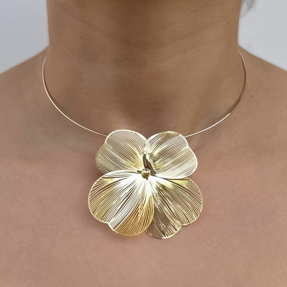 Choker aro com pingente dourado vazado super leve em formato de flor.