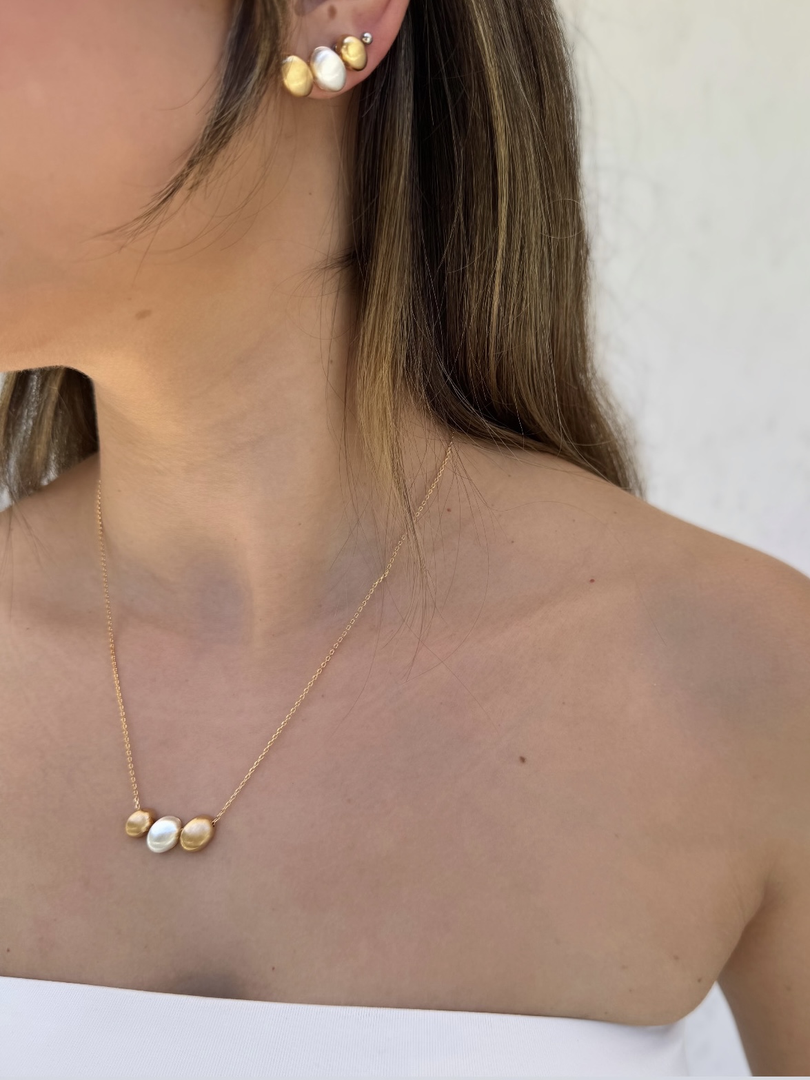 Colar delicado com pingente central composto por três formas ovais interligadas e mix de banhos prateado e dourado com acabamento polido fosco. Sua corrente possui regulagem de altura em três tamanhos, auxiliando na formação de mix de colares.