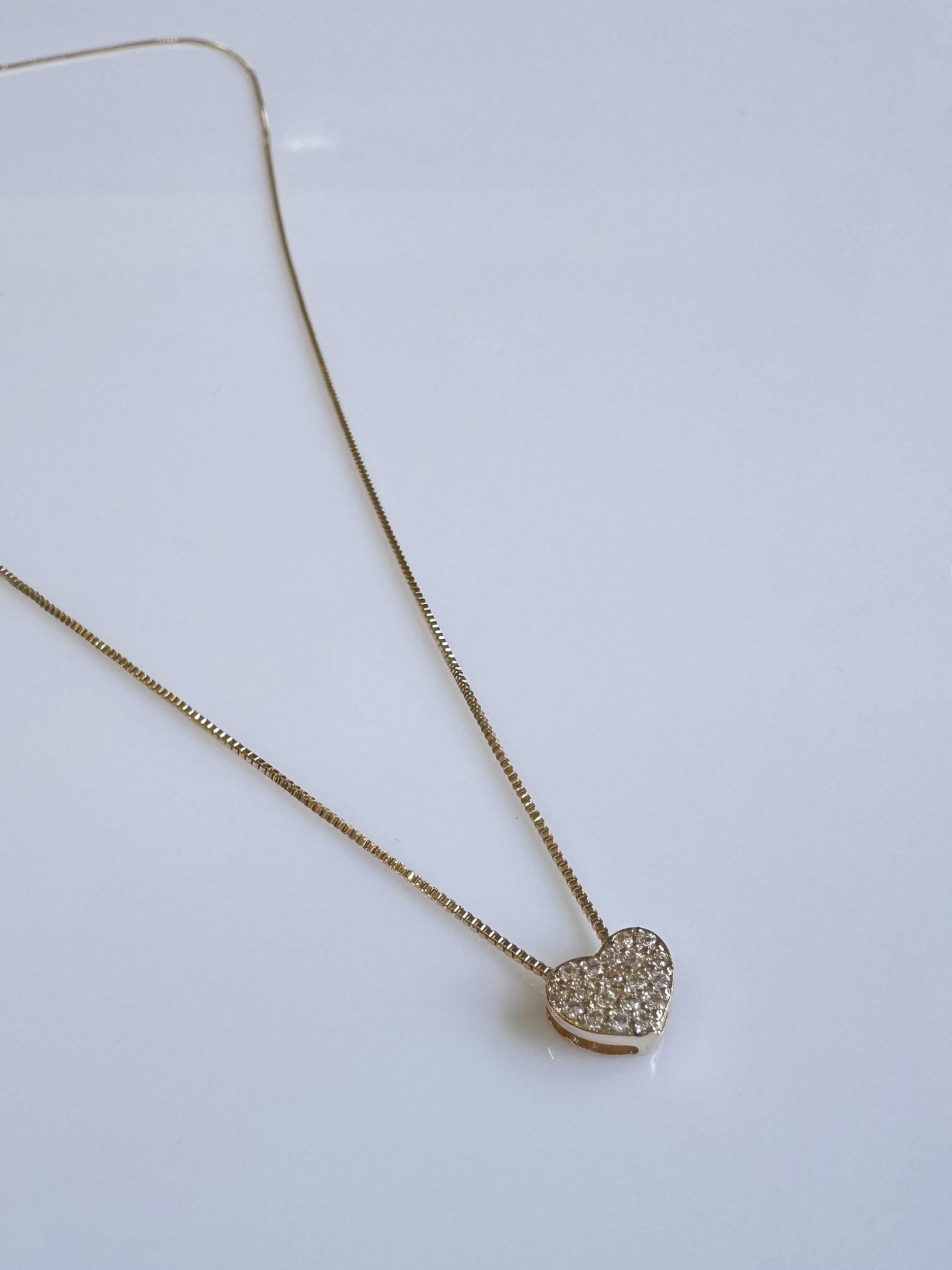 Cordão com corrente em veneziana e pingente em formato de coração cravejado em zircônia branca.