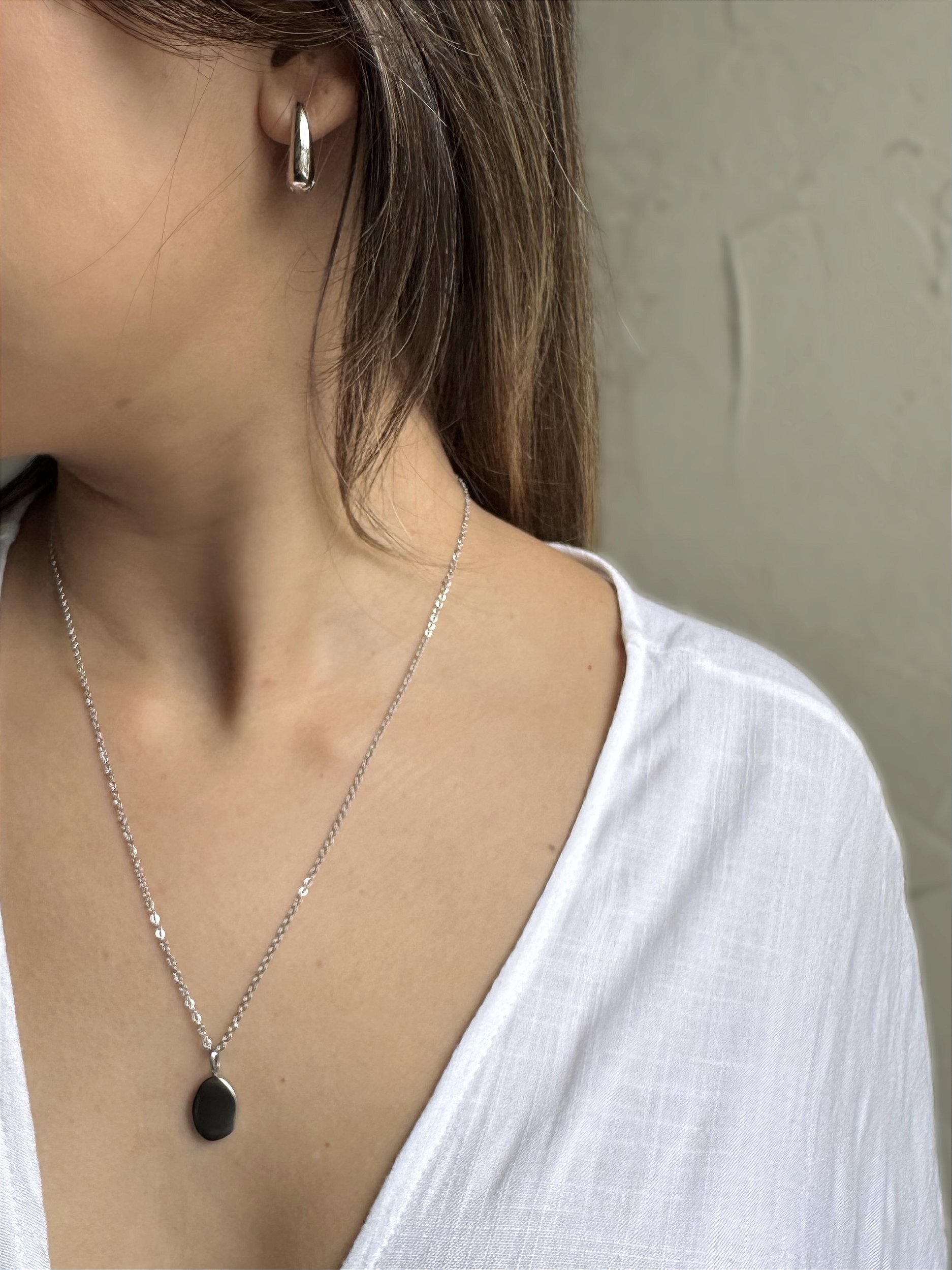 Delicado e elegante, este cordão feito em aço inoxidável apresenta corrente fina de elos uniformes e brilhantes, que confere um visual leve e sofisticado. O pingente tem formato orgânico com acabamento polido e superfície lisa que dá um toque de modernidade para a peça.