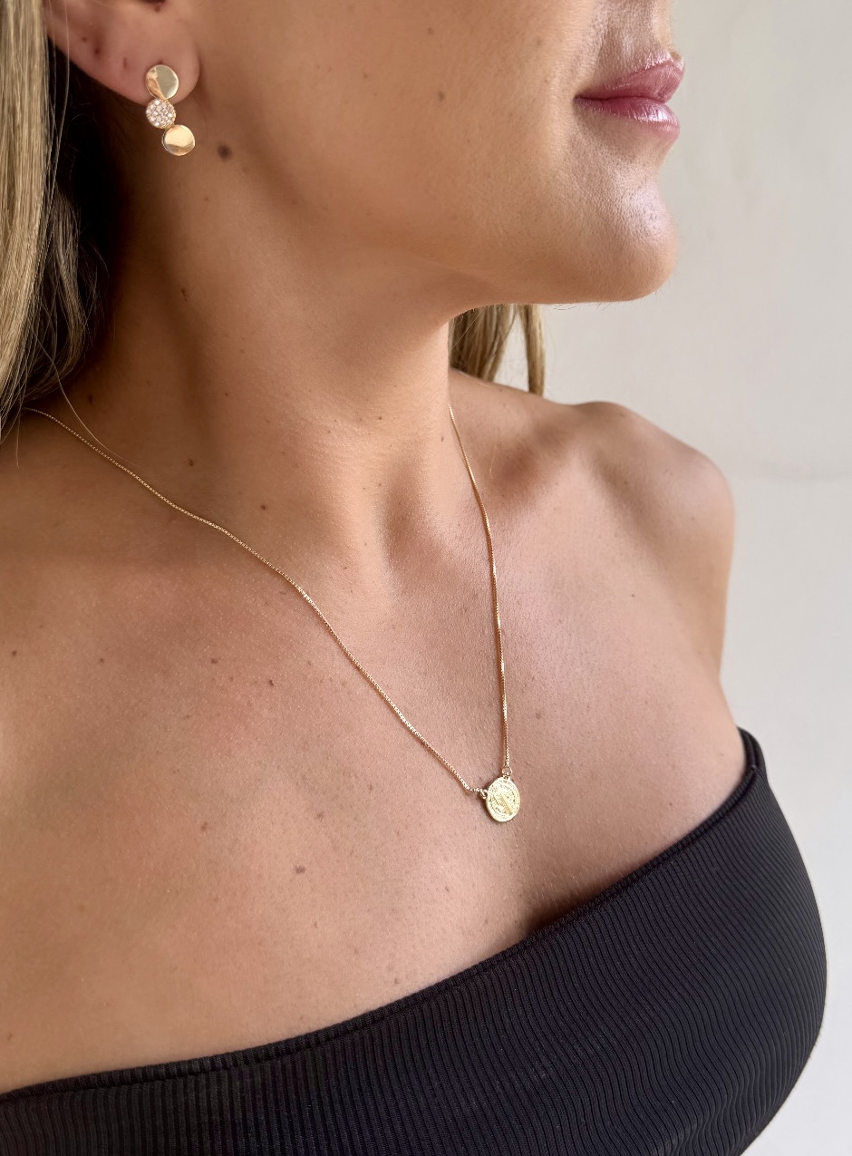 Escapulário de São Bento em semijoia, uma peça que une fé, proteção e elegância. Confeccionado em semijoia, o escapulário apresenta medalhas de São Bento, símbolos poderosos de proteção espiritual e bênçãos. As medalhas são ricamente detalhadas, com a imagem do santo e inscrições que reforçam sua proteção. A corrente veneziana, com sua malha fina e brilhante, complementa o design delicado da peça, proporcionando um toque de sofisticação e delicadeza. Ideal para quem busca aliar espiritualidade ao estilo em um acessório de uso diário.